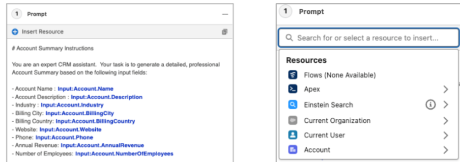 - Prompt Builder in Summer ’25, showing grounded input fields and available Copilot resources such as Apex, Flow, and CRM data.